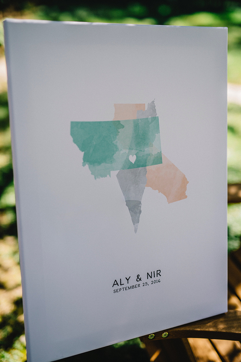 This custom art piece was a beautiful addition to A&N’s wedding. The bride had grown up in Montana and the groom in Israel. They now reside in California together. I loved how they incorporated their upbringing, with their current life together in this beautiful artwork. Guests were invited to sign this, as a keepsake for the newlyweds to hang in their new home together.