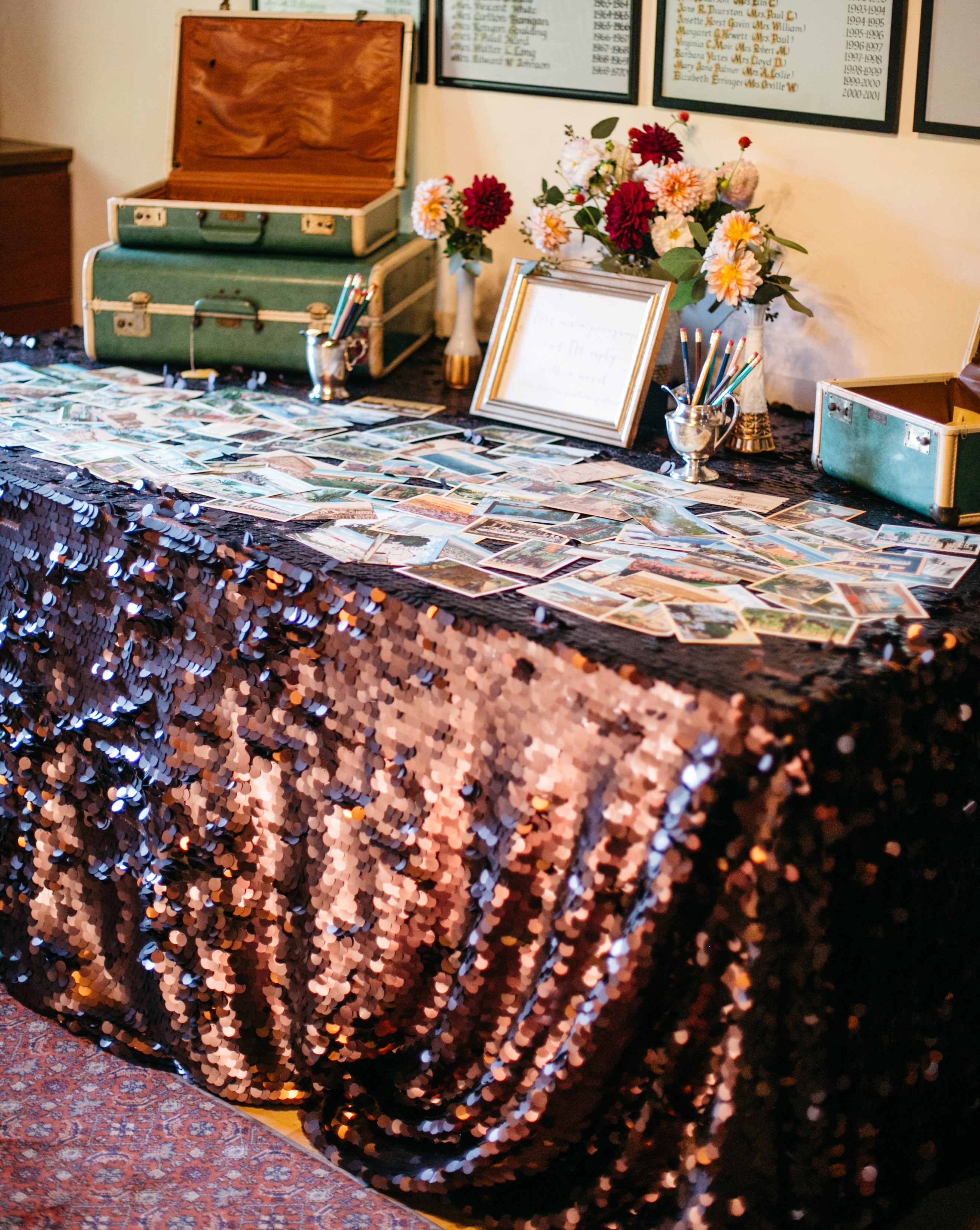 For those couples that love to travel, signing a vintage postcard is a great idea. Adding some vintage suitcases to collect the signed postcards is also super cute!